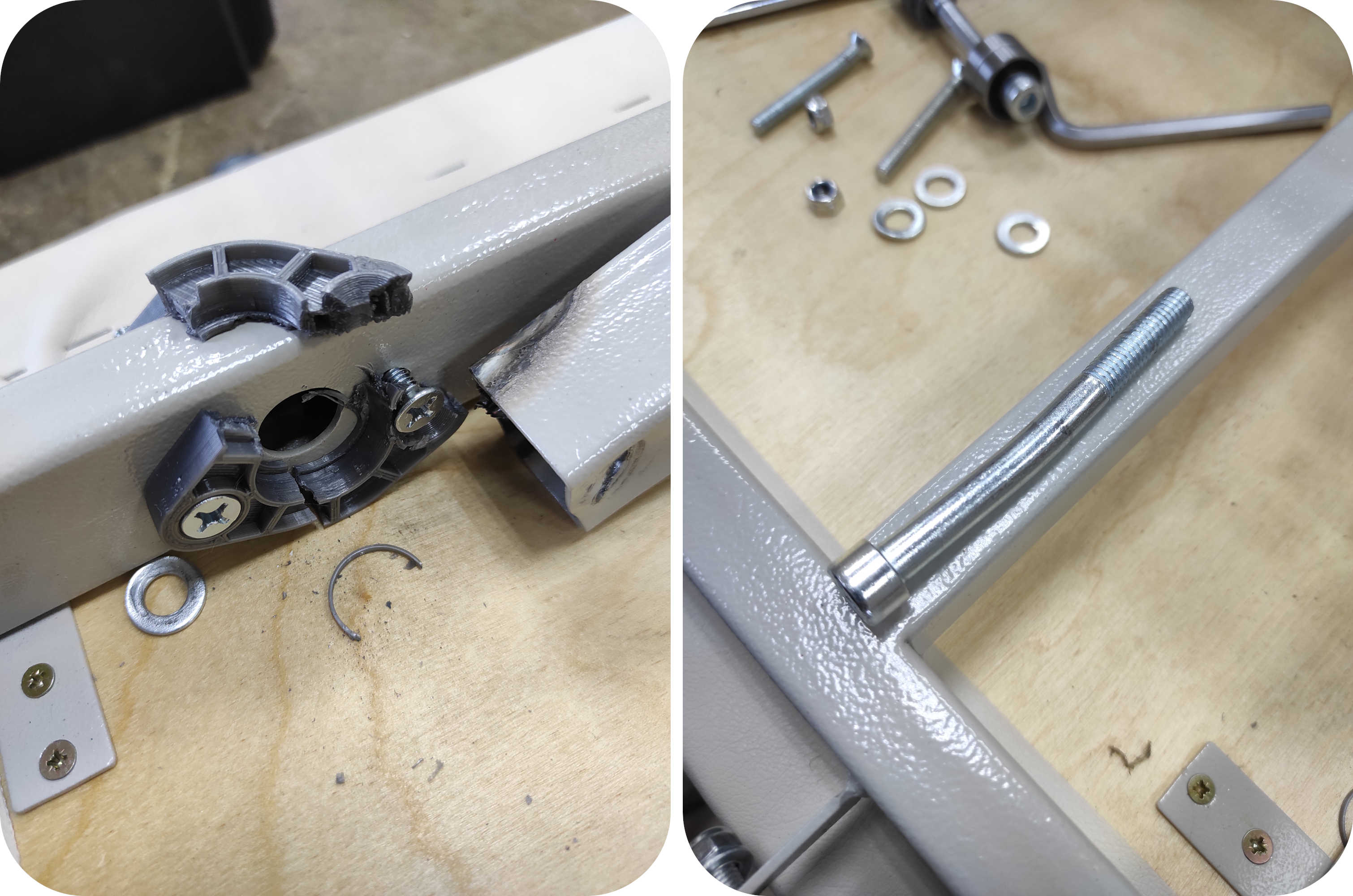 Статья всё больше о 3D печати. Всё началось с того, что напечатанные детали захотелось использовать в силовых элементах. Вопрос с шарнирными соединениями в массажных столах оставался открытым. Что будет, если установить дешёвенькие подшипники качения в пластиковые корпуса, а сами корпуса закрепить на профильной трубе, подумал я. Подшипник сядет в пластик с преднатягом, корпус будет жёстко закреплён, а в качестве оси можно использовать винт в снутренним шестигранником, который гладкой частью сядет во внутреннее кольцо подшипника с небольшим зазором. На зазор этот можно наплевать, потому что биения нас в этом соединении совешенно не волнуют. Нас волнуют скрипы. Короче, всё стянется и получится полноценный шарнир.