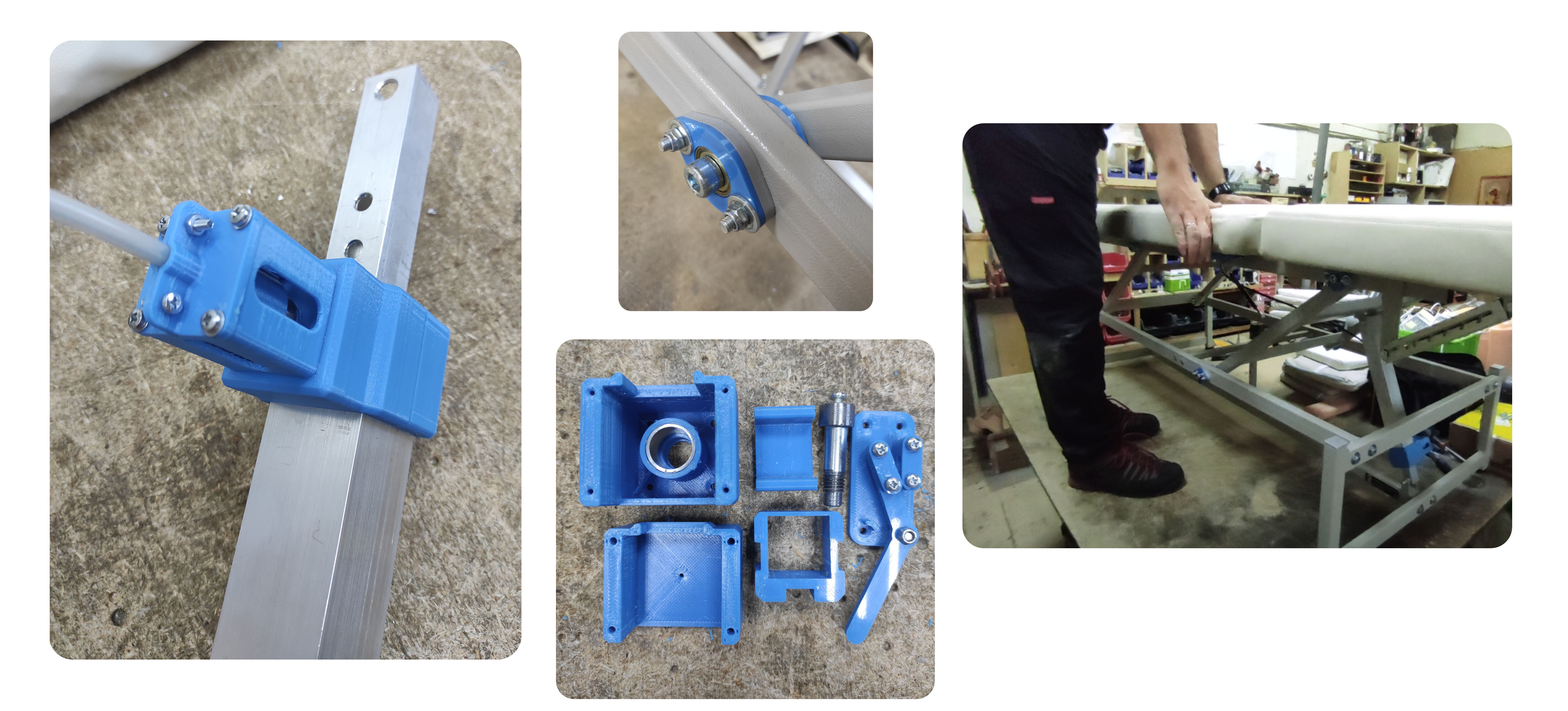 Шарниры опор, к слову, сделали на подшипниках качения и тоже не без пластика. Это оказалось очень удачным и недорогим решением, которое навсегда избавило огромные столы для реабилитации малоподвижных пациентов от скрипов.