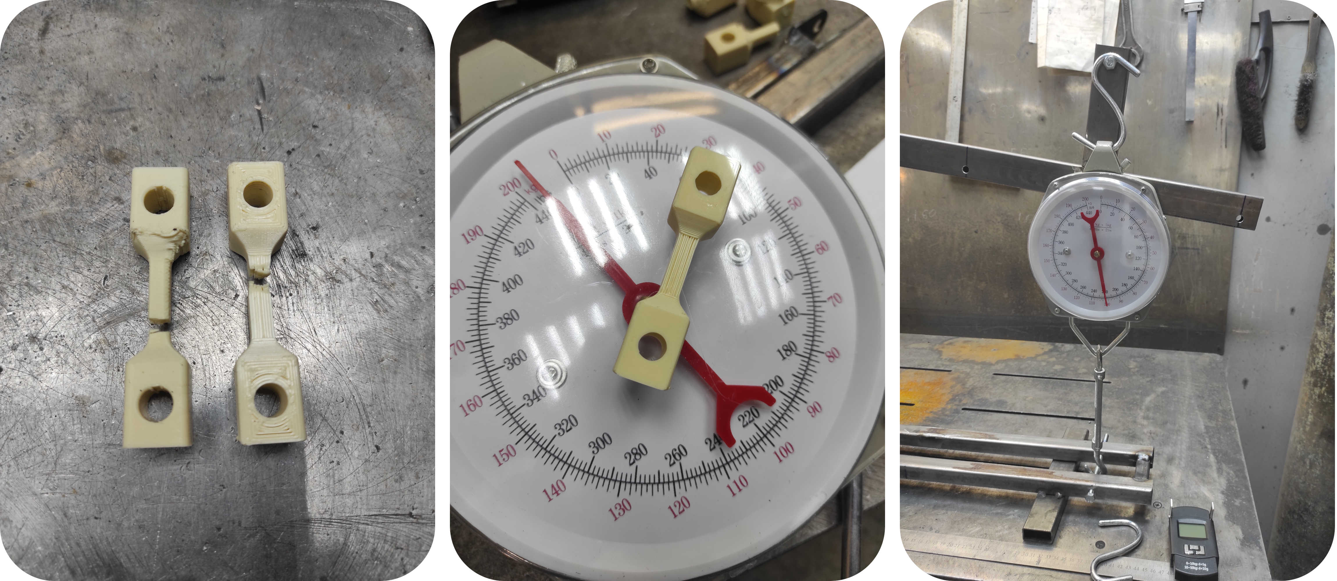 Во-первых, изготовили экземпляр для испытаний. Во-вторых, изготовили стенд для растяжения образцов из пластика. Издевались по полной, тщательно фиксируя результаты в специальный журнал испытаний. Всё как положено. Почти по-взрослому. На смятие решили не испытывать, потому что, как показала практика, все пластики и PETG (самый прочный из доступных и легко печатаемых) в частности практически не сминаются, а рабочие поверхности не деградировали в процессе эксплуатации в тех конструкция, в которых применялись задолго до эпопеи с корпусами подшипников.