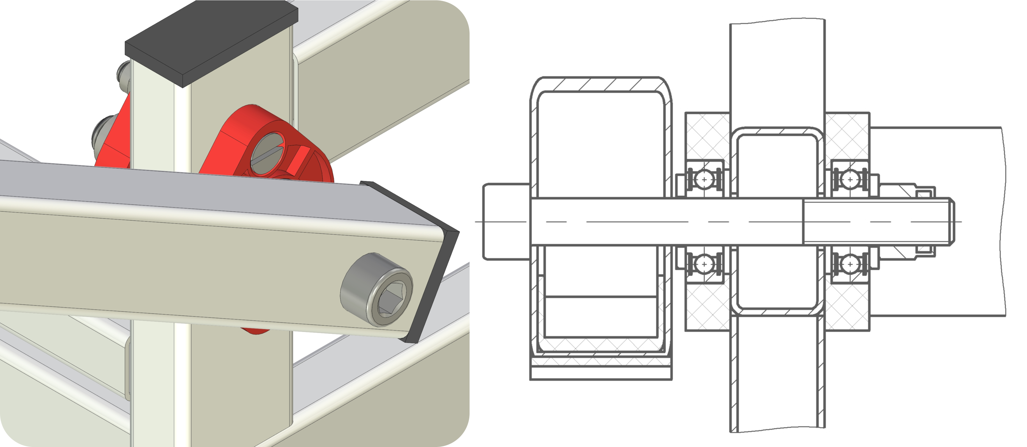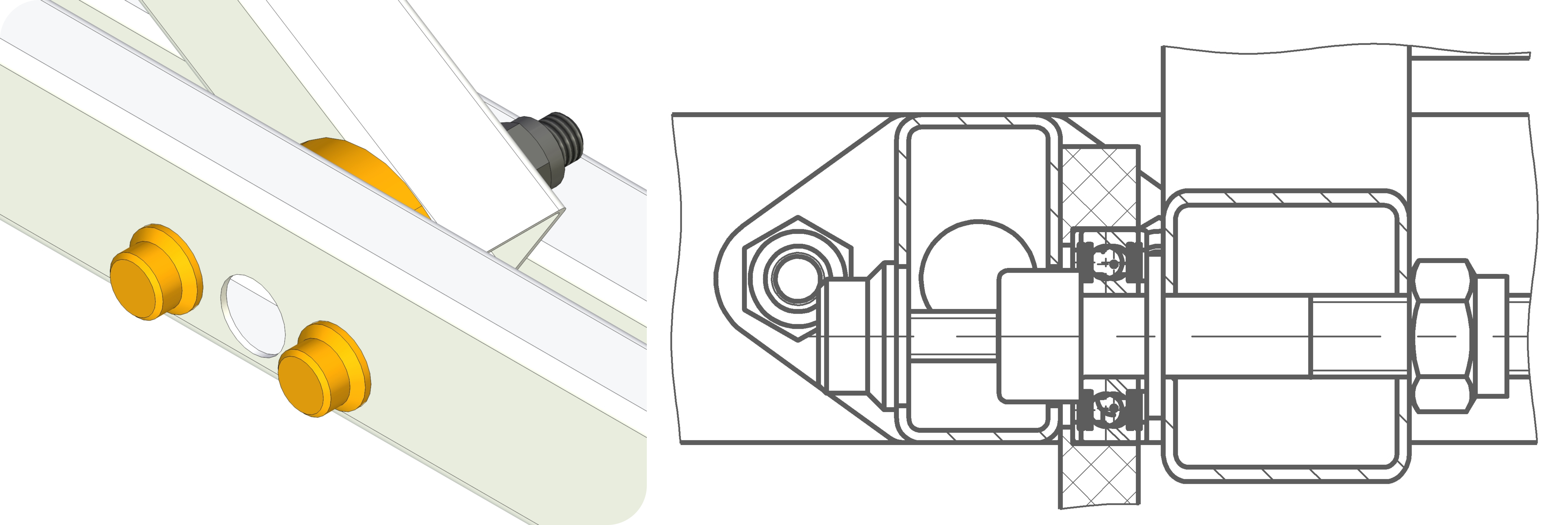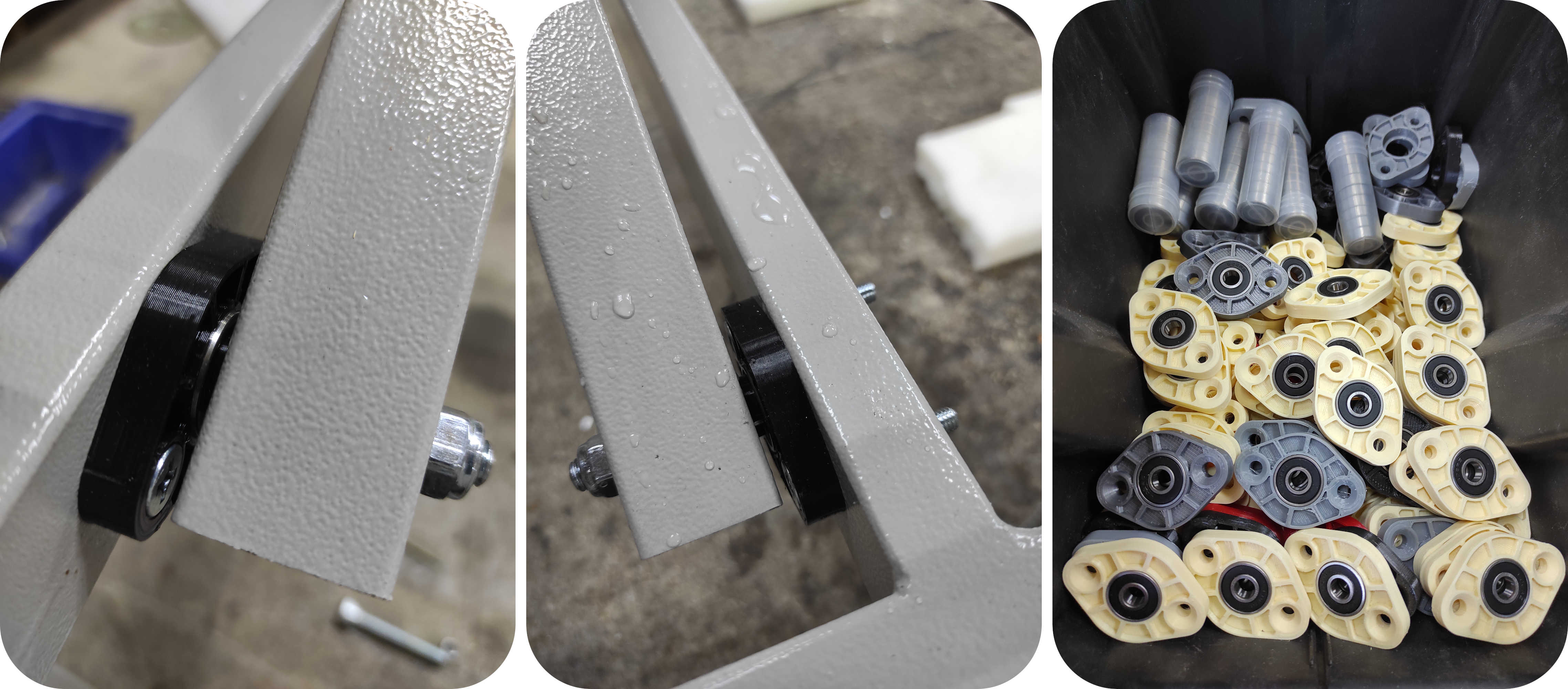 Статья всё больше о 3D печати. Всё началось с того, что напечатанные детали захотелось использовать в силовых элементах. Вопрос с шарнирными соединениями в массажных столах оставался открытым. Что будет, если установить дешёвенькие подшипники качения в пластиковые корпуса, а сами корпуса закрепить на профильной трубе, подумал я. Подшипник сядет в пластик с преднатягом, корпус будет жёстко закреплён, а в качестве оси можно использовать винт в снутренним шестигранником, который гладкой частью сядет во внутреннее кольцо подшипника с небольшим зазором. На зазор этот можно наплевать, потому что биения нас в этом соединении совешенно не волнуют. Нас волнуют скрипы. Короче, всё стянется и получится полноценный шарнир.
